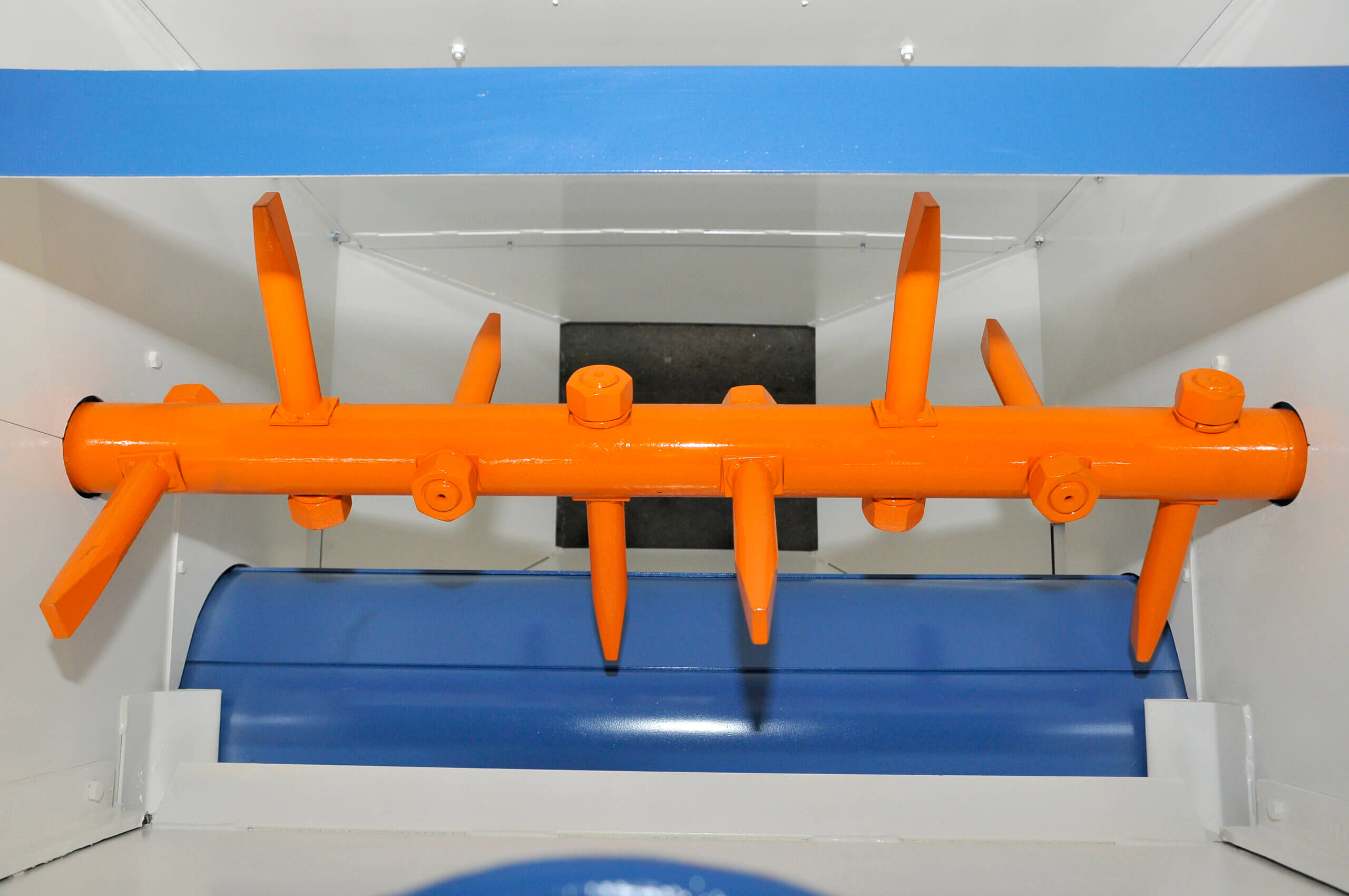 Quando a argila é carregada no sistema, uma esteira interna a transporta para a saída, onde uma comporta ajustável controla o fluxo, enquanto um eixo com hastes de corte duplo facilita a passagem e corta torrões.