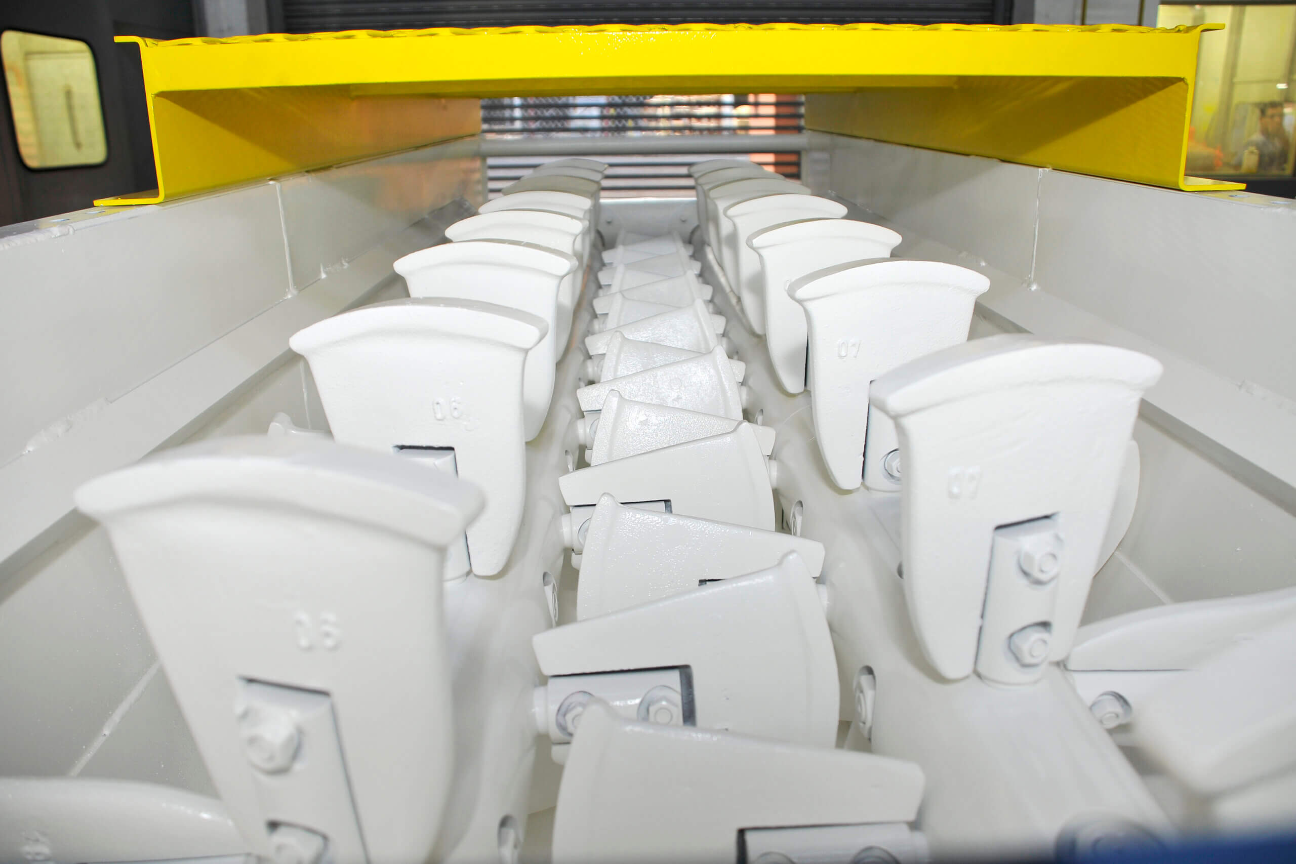 Esse processo é realizado por meio do deslocamento gradual da argila em uma bacia misturadora, equipada com dois eixos horizontais de lâminas orientáveis em dupla carreira, acionados por um sistema de engrenagens de dupla saída. A versatilidade do equipamento permite a alteração do ângulo de inclinação das lâminas misturadoras, possibilitando o ajuste do tempo de mistura conforme a necessidade da linha de extrusão, otimizando a produção.